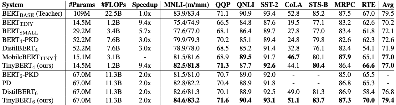- 6 레이어 TinyBERT의 경우 BERT_BASE 보다 작은 파라미터와 FLOPs를 가지면서 성능은 비슷하게 유지됨